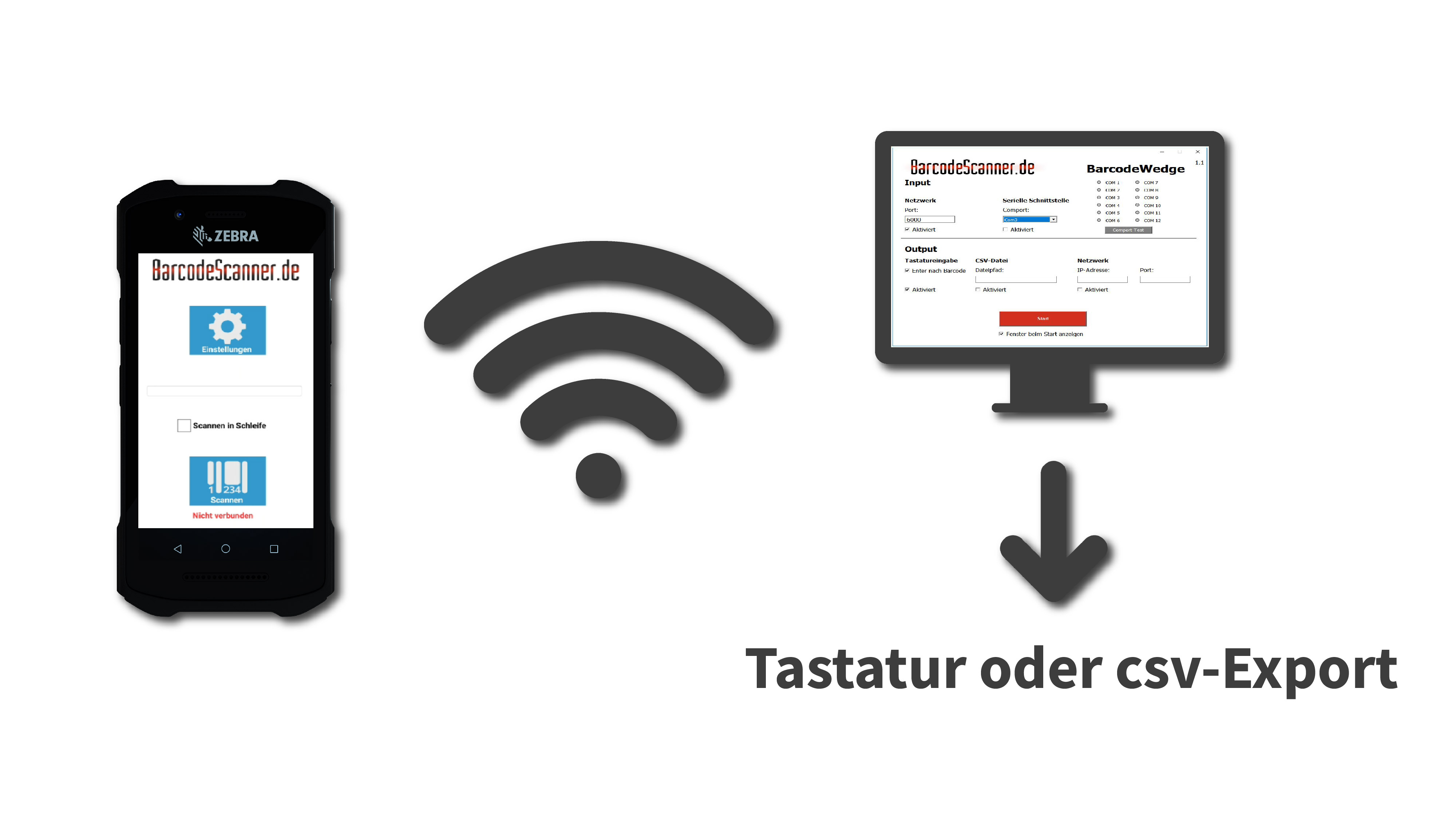 Das Menü der App sowie der dazu passenden Barcode-Wedge ist übersichtlich und einfach zu bedienen. Über die Wedge können Daten empfangen und die Übertragung eingerichtet werden.